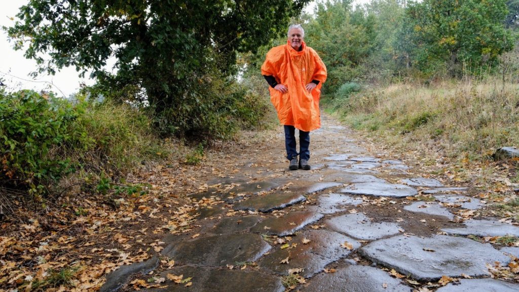 La pluie alterne avec le soleil. Aujourd’hui, c’est donc un jour pluie. En fait très très pluie… Nous marchons avec la cape toute la journée. Le parcours du jour est très beau malgré le mauvais temps qui nous a souvent forcés à regarder le sol plutôt que la pluie. De toute part sur des kilomètres, le parcours passe au milieu de champs de noisetiers. Nous n’avons rencontré aucun marcheur de toute la journée (vu le temps, ce n’est pas vraiment étonnant), sauf un jeune français qui marche depuis Montélimar et va à Rome, mais qui pense bien continuer vers les Pouilles. Il pensait bien faire du camping cette nuit, mais un peu plus tard nous l’avons vu attendre le bus.