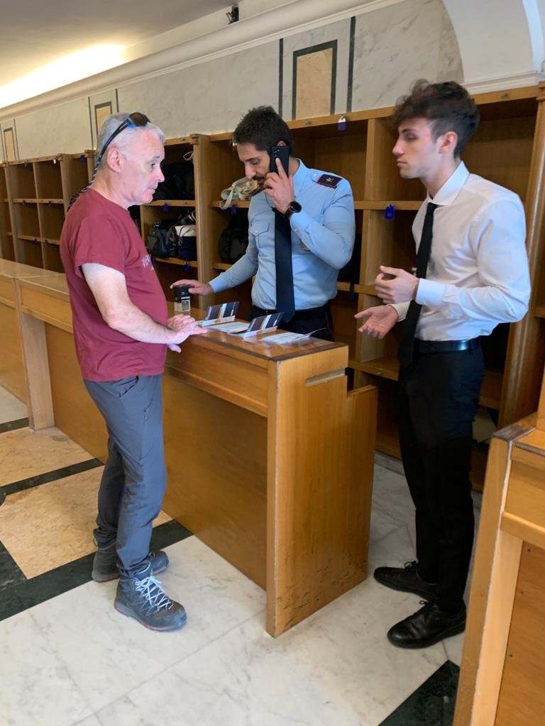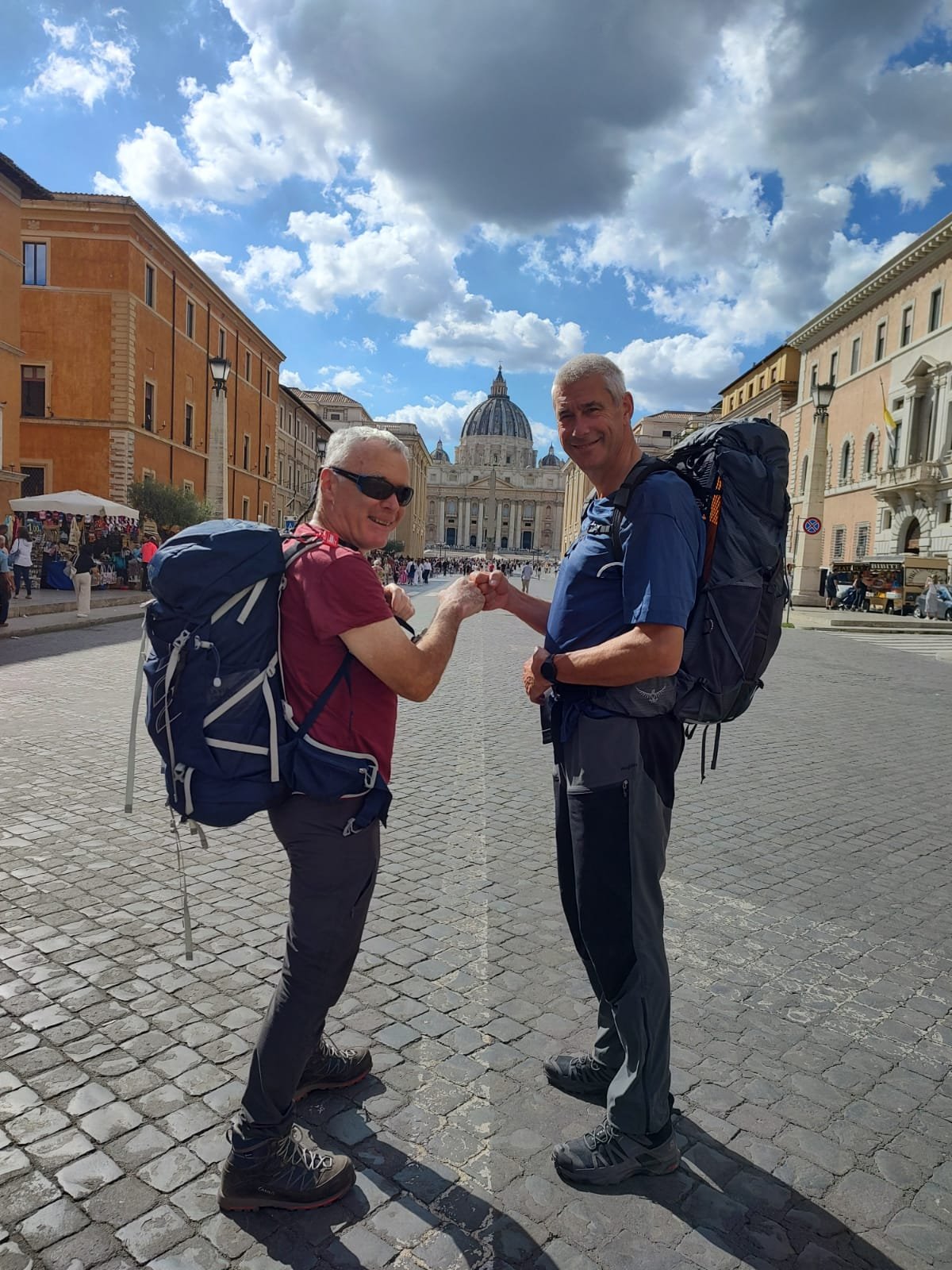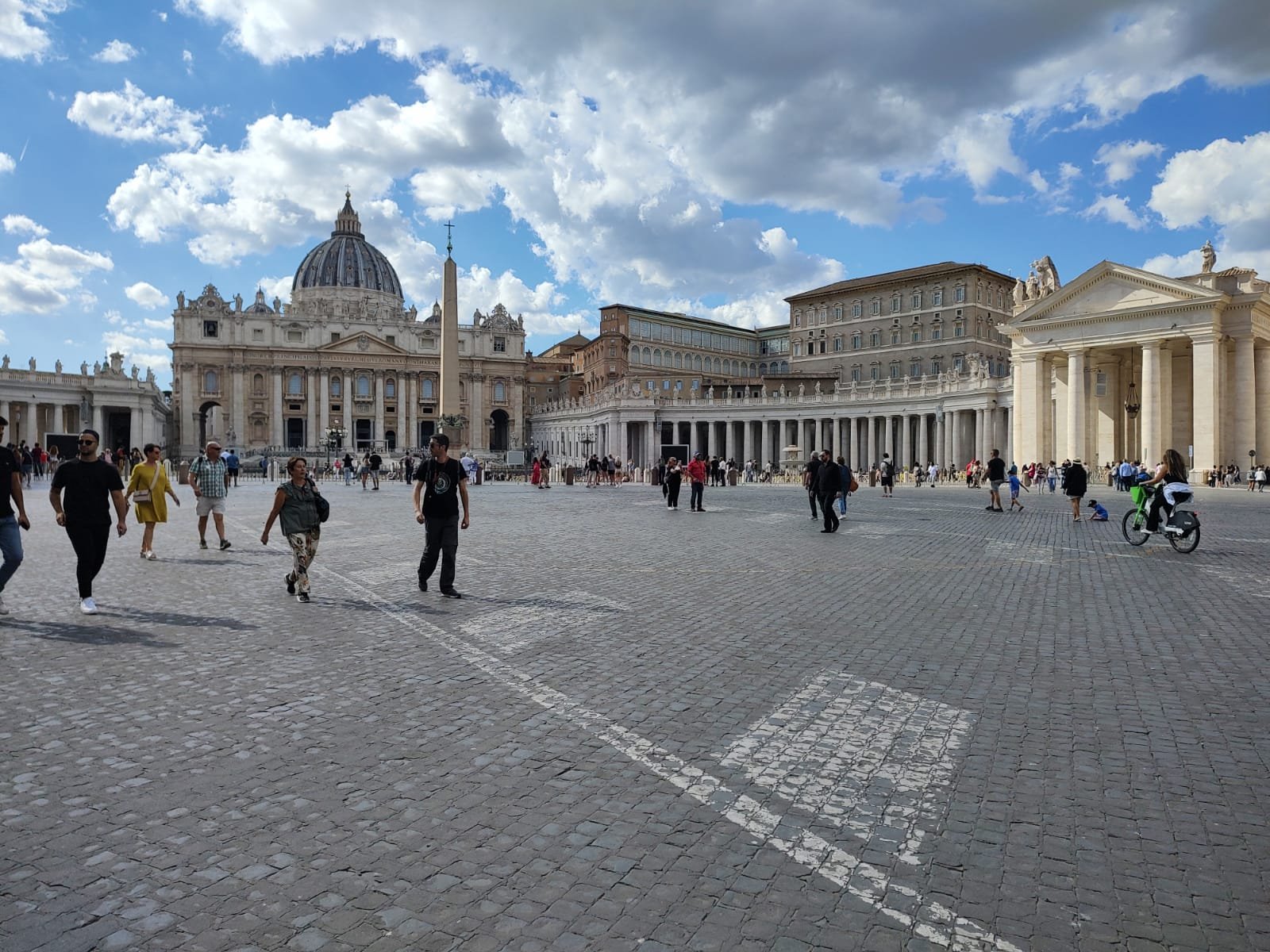 Je reviens sur la journée d’hier. Arrivés mercredi soir, ce jeudi, nous sommes retournés au Vatican afin d’obtenir notre cachet du pèlerin. Ce fut laborieux parce qu’ils n’avaient jamais eu à délivrer un cachet à ceux qui partent de Rome… Finalement nous sommes allés à la sacristie du Vatican et un des gardes nous a résolu le grave blocage administratif.