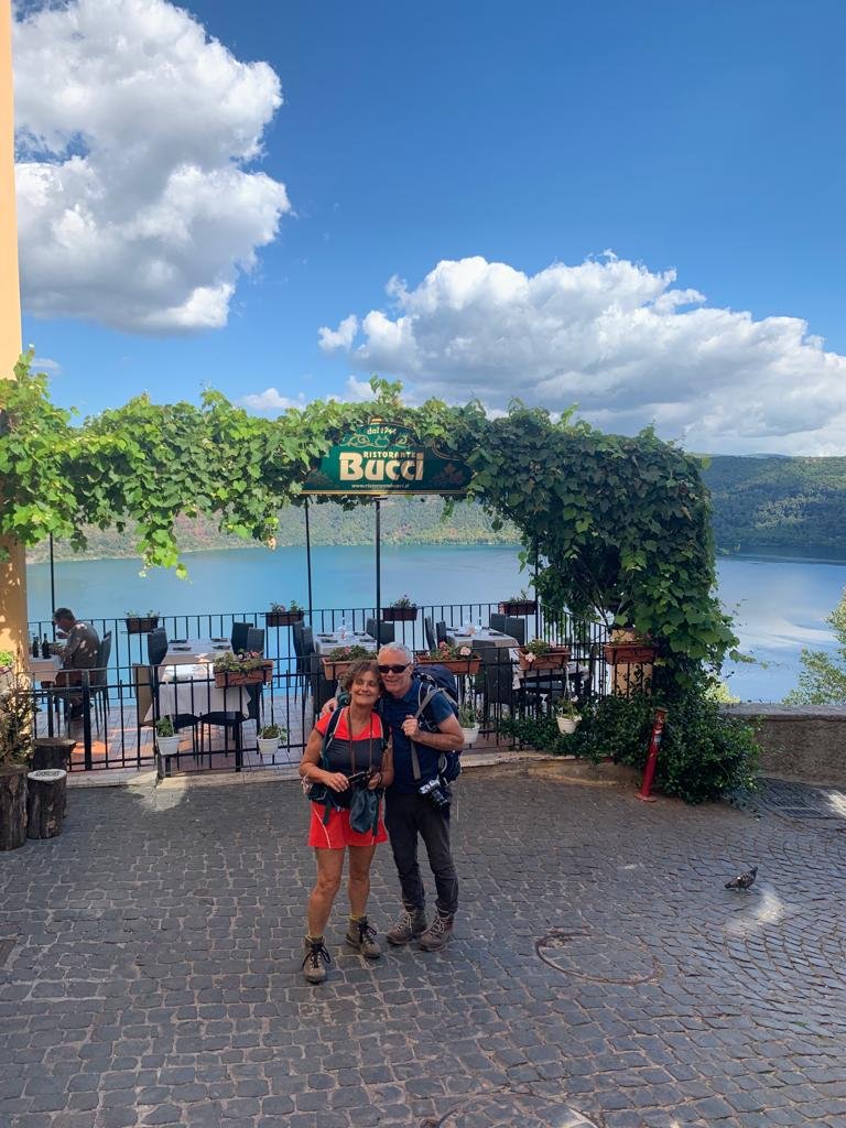 Aujourd’hui nous venons de boucler notre 1re étape. Nous sommes arrivés à Castel Gondolfo où se trouve la résidence d’été du Pape. La petite ville est perchée sur la crête d’un très ancien volcan. Le cratère du volcan forme un beau lac.