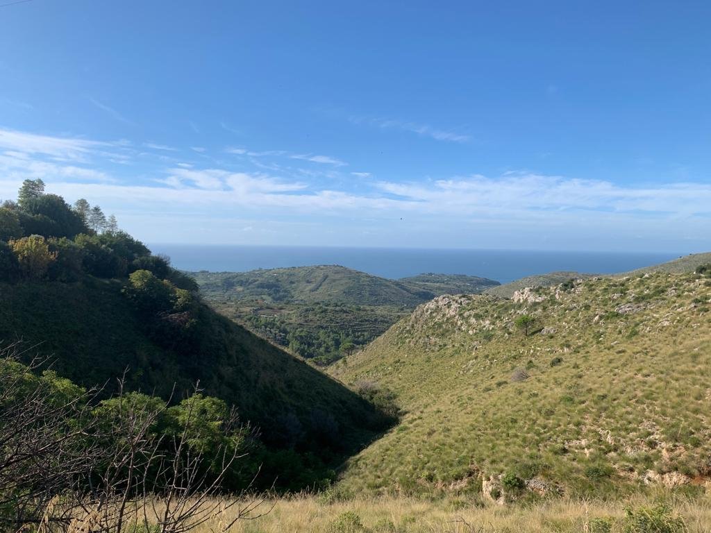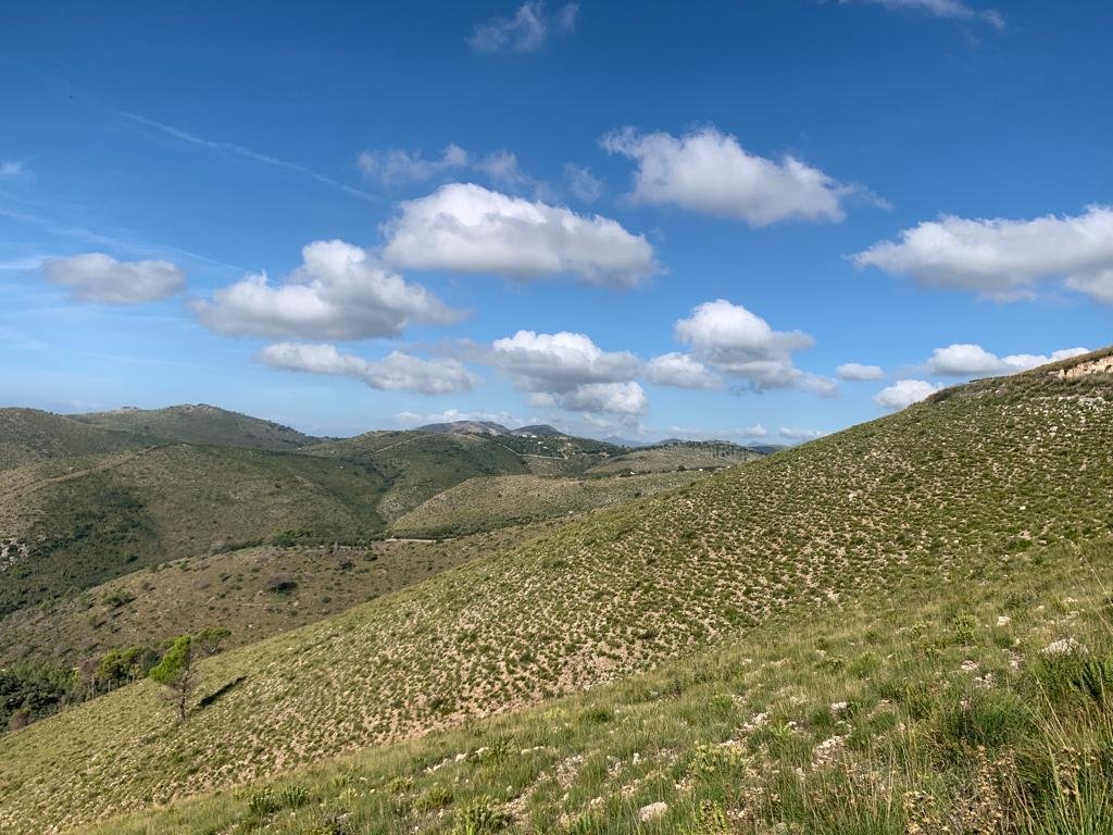 Après une demi-heure de grand’route, le chemin asphalté s’enfonce dans la nature la plus agréable, pas de bruit, oliviers, collines ensoleillées tout autour de nous. On ne rencontre personne ! C’est vraiment parfait, d’autant que nous apercevons maintenant la mer toute bleue (non pas Méditerranée mais la mer Tyrrhénienne, oui oui, on apprend tous les jours).