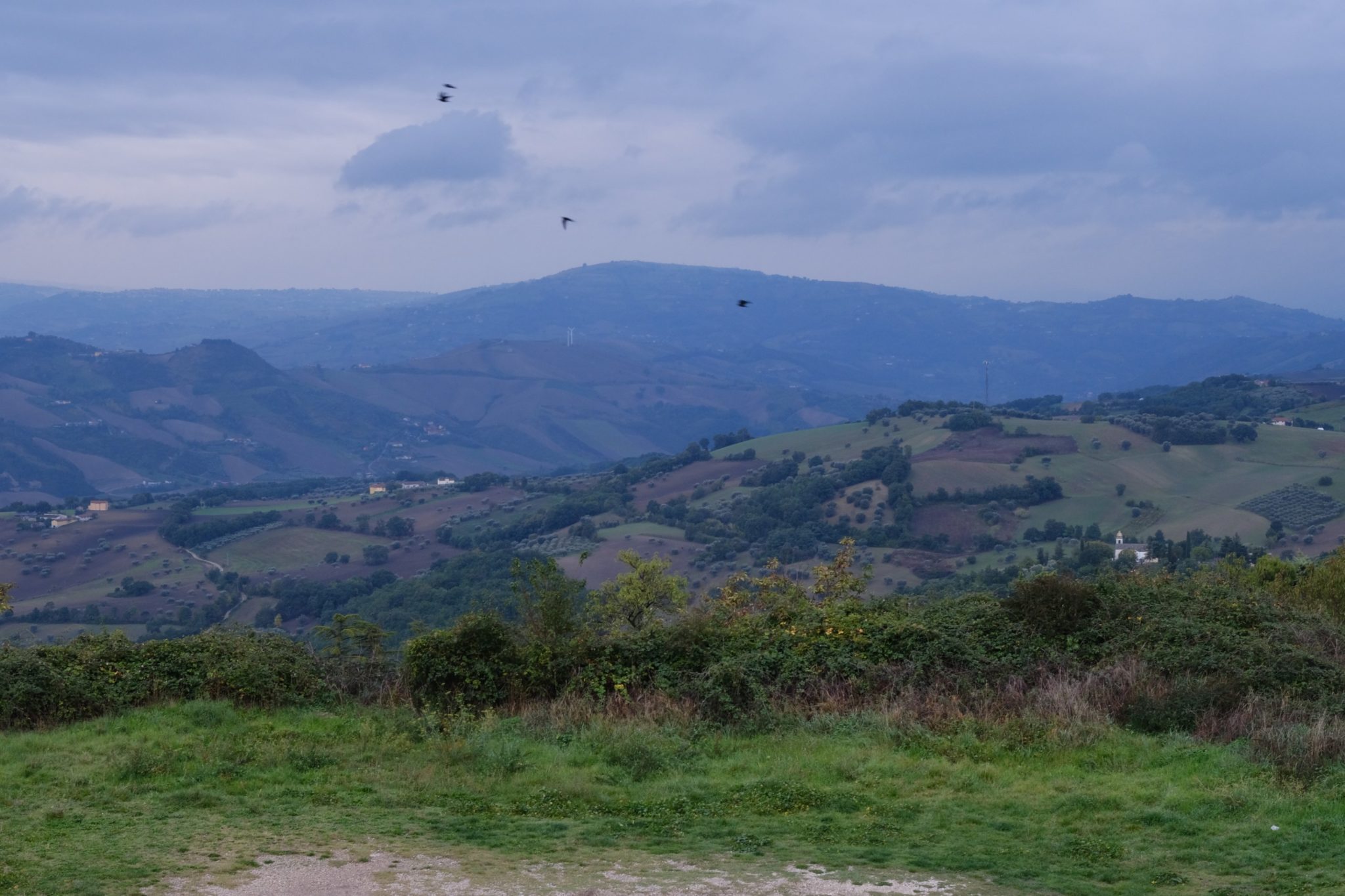 Le brouillard et le soleil jouent à cache-cache ce matin. Qu’importe, nous nous lançons dans la grimpée du jour. Vues … à perte de vue en montant progressivement. Calme, silence et nature. On grimpe, on grimpe, on traverse de beaux sentiers remplis de noyers et de châtaigniers. Les locaux sont au taquet pour ramasser ces fruits d’automne.