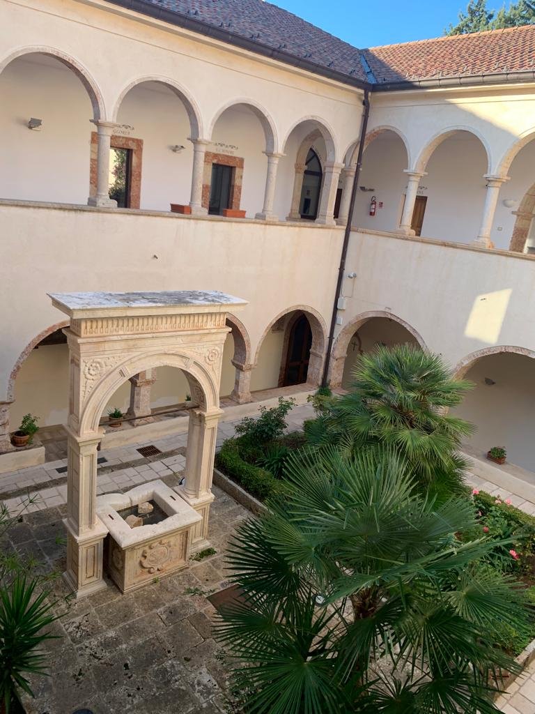 Nous arrivons dans un beau couvent perdu dans la nature et géré par des privés. Belle façade, beau cloître, et luxe suprême: une chambre avec douche par personne!