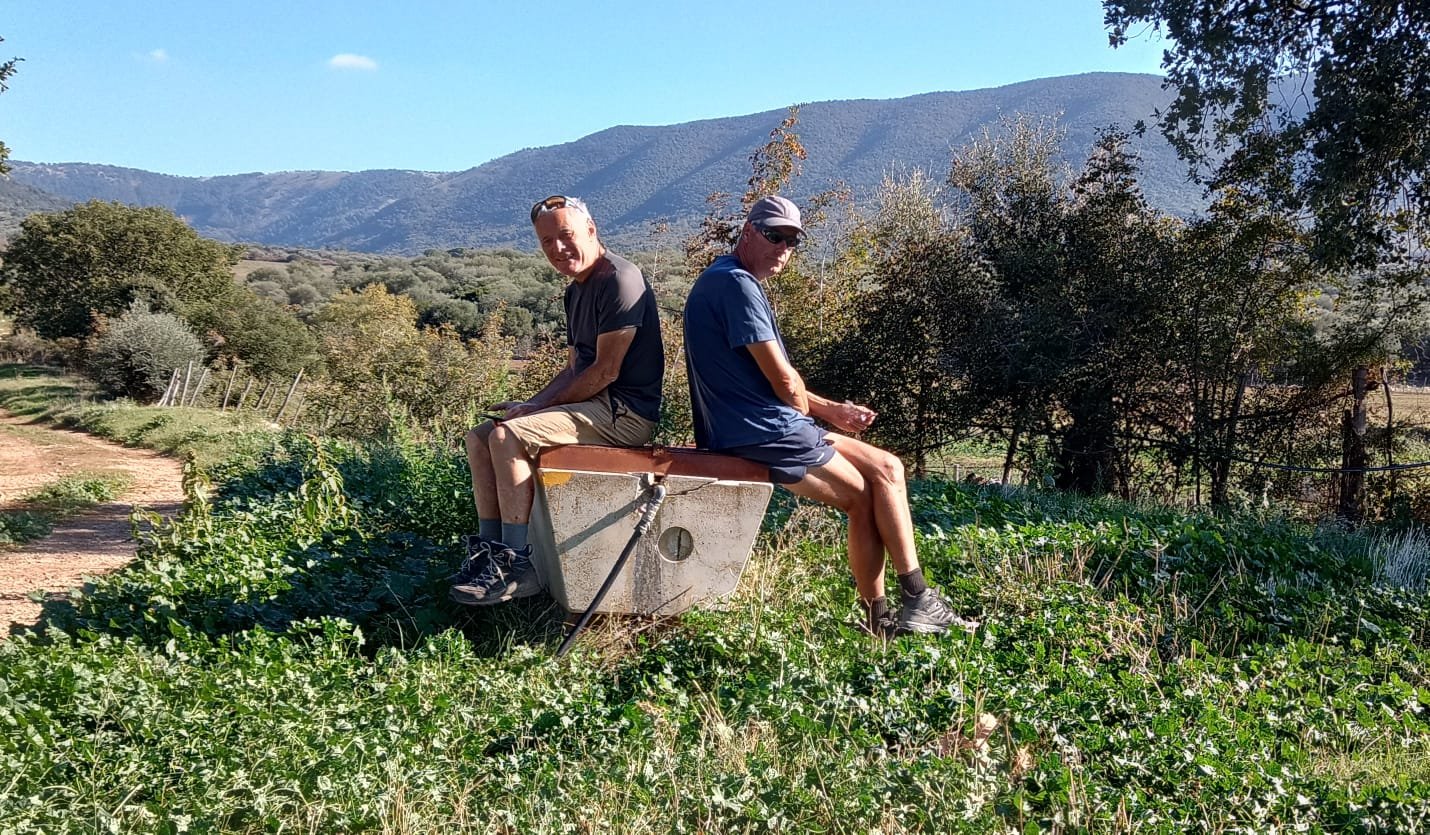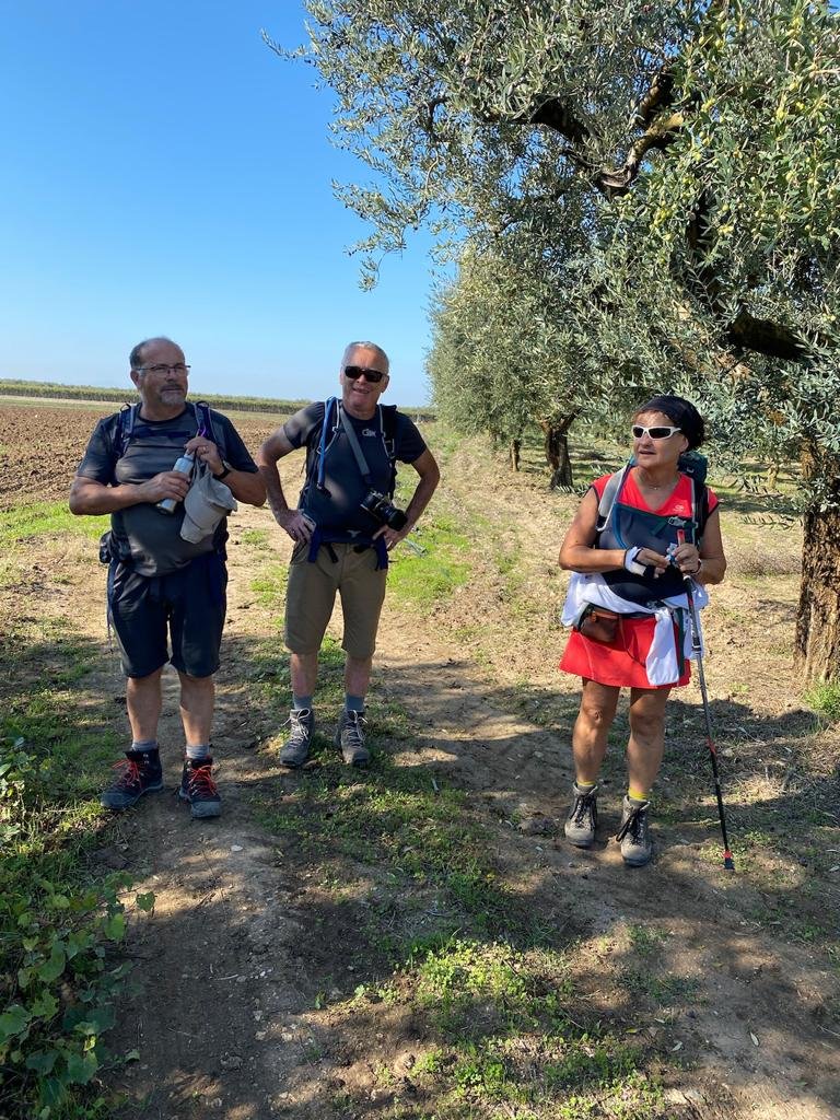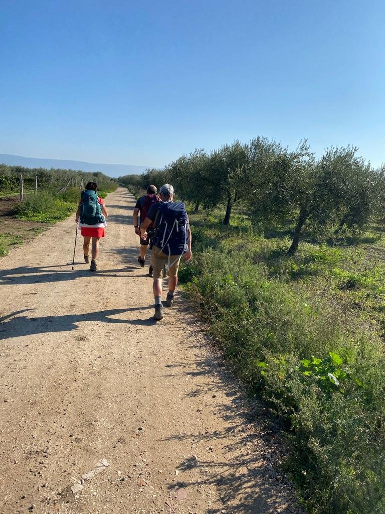 Nous marchons le long de milliers d’oliviers, entrecoupés de vignes en espaliers. Superbes alignements à perte de vue. La récolte des olives commence un peu partout. La chaleur se fait sentir.