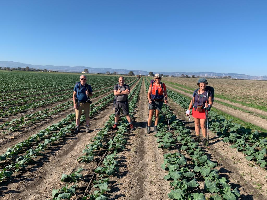 Nous marchons le long de milliers d’oliviers, entrecoupés de vignes en espaliers. Superbes alignements à perte de vue. La récolte des olives commence un peu partout. La chaleur se fait sentir.