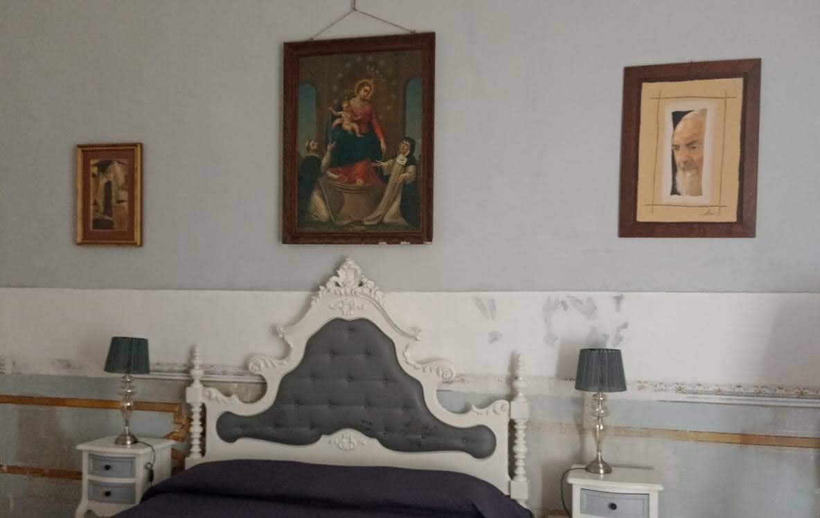 Isabelle nous a déniché un beau gîte dans une bâtisse datant du 15me siècle. Le père Pio (à droite sur la photo) veille sur notre lit conjugal