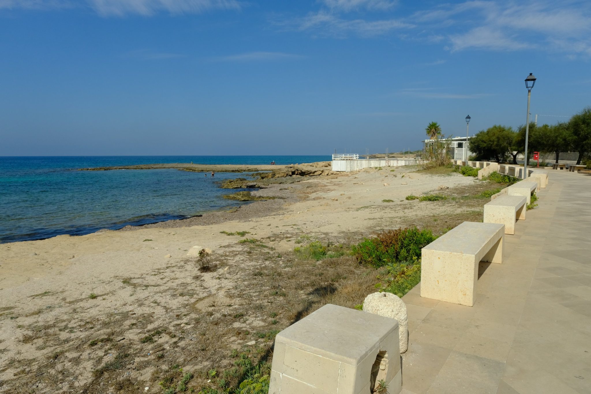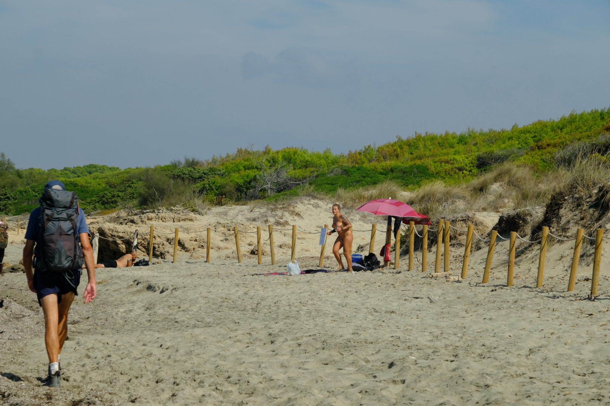 Ensuite nous arrivons sur la côte dans une belle petite station balnéaire… Mais c’est le désert complet : à 11h, pas moyen d’y prendre un café, d’y acheter de l’eau et un panino pour ce midi. C’est dit : nous marcherons sur nos maigres réserves d’eau et de fruits secs pour les 15 km restants (de tous les peuples de la Gaule, les Belges sont les plus braves).