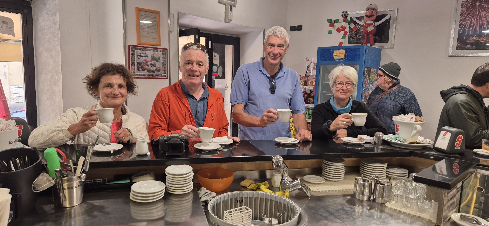Déjeuner en deux temps ce matin. D’abord dans notre B&B, un bout de pain et un bout de pizza froide, un tout petit café, et hop, nous sommes partis. Arrêt un peu plus loin au bar du village d’Arone pour boire au comptoir un bon capucino.
