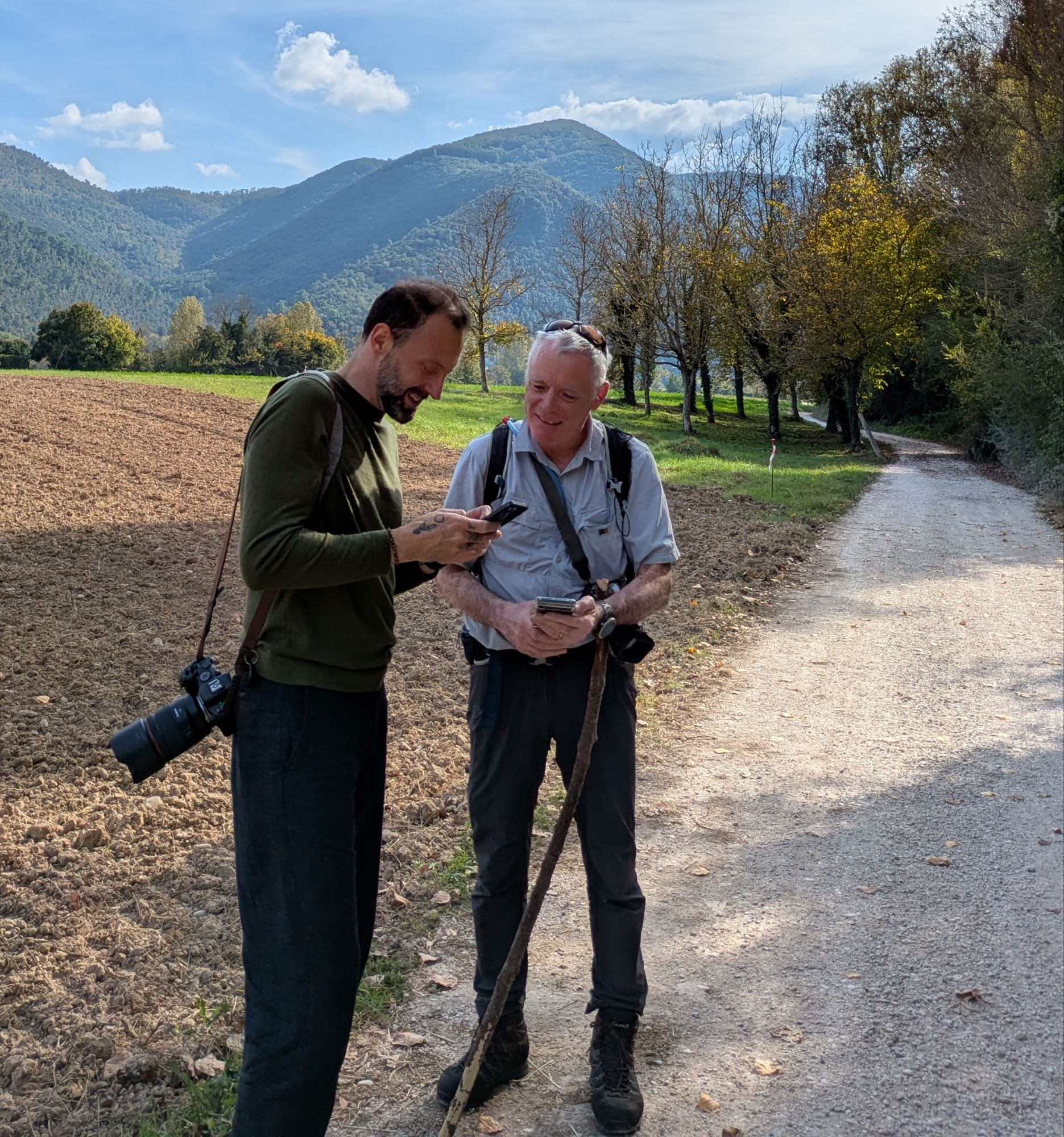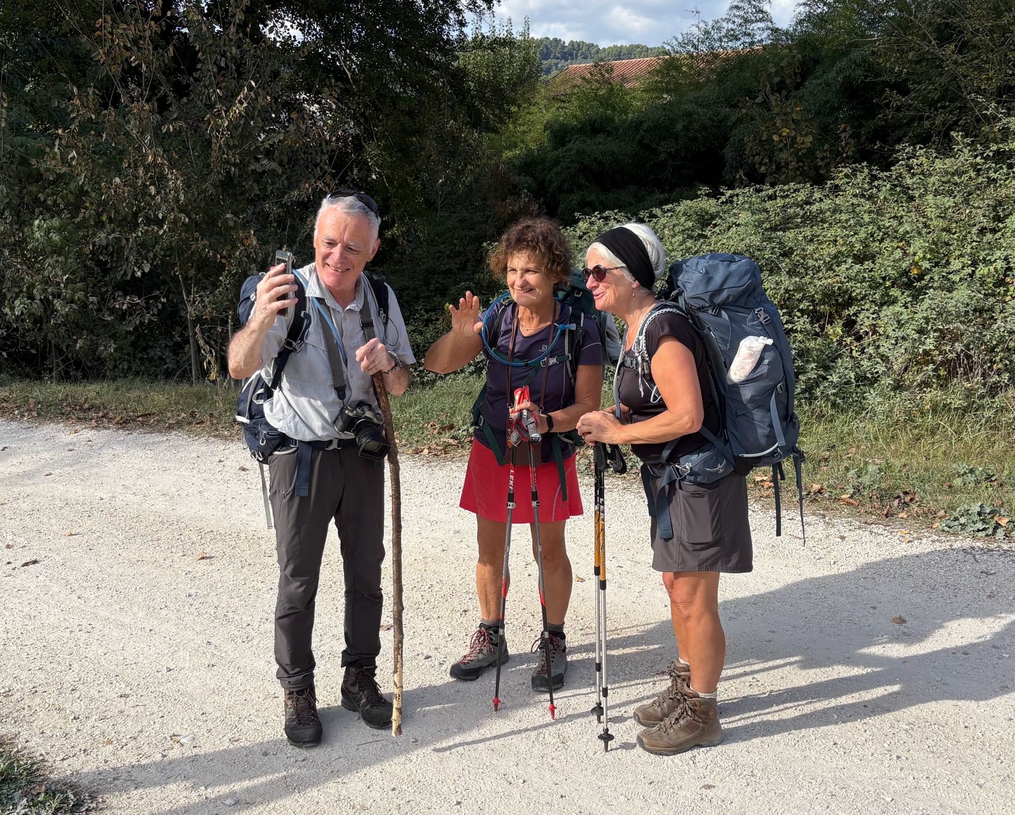 Arrivée au barrage et sa chute d’eau. Descente très raide pour arriver dans la plaine. Pic-nic nature. Belle après-midi douce. Bientôt nous aurons un torticolis à force de regarder tellement de petits villages accrochés à chaque colline. Et nous partageons une petite visio avec Gilles et Charlotte.