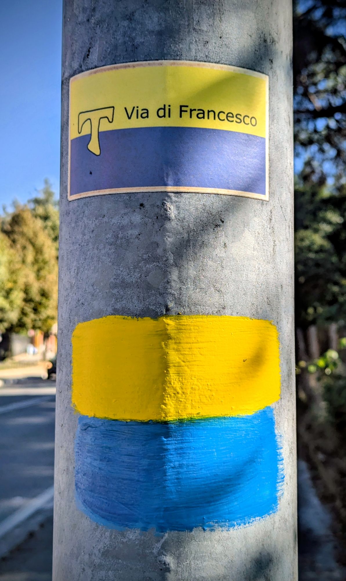 Temps splendide, température idéale, que demander de plus ?Rapidement engagés dans les chemins d’une réserve naturelle boisée et vallonnée, nous profitons aussi de belles vues sur la campagne romaine. Rencontres croisées avec des pèlerins qui reviennent de Florence ou d’Assise, et aussi avec ceux qui empruntent ce chemin vers Assise. Ils sont de nationalité française, suisse ou australienne !