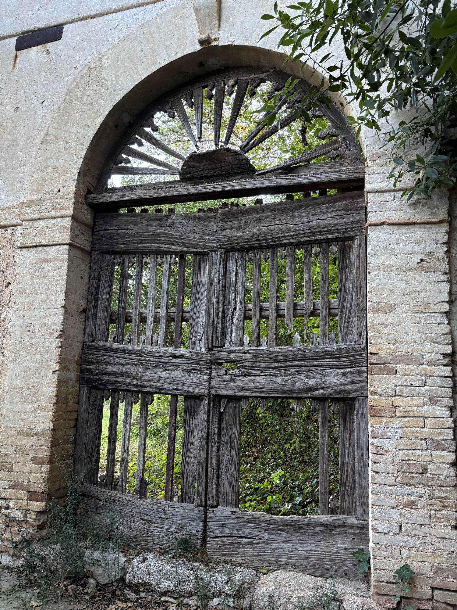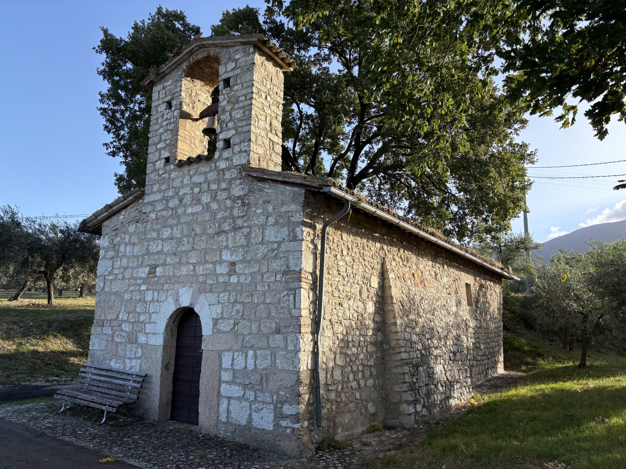 Toujours des oliviers à perte de vue. Et la barrière du chemin de St François nous accompagne toujours. D’adorables petites chapelles ( malheureusement souvent fermées), des églises et des couvents jalonnent notre chemin… qui nous réserve parfois des surprises; ainsi ce cheval entraîné dans un manège par deux jeunes gens assis sur une mobylette !