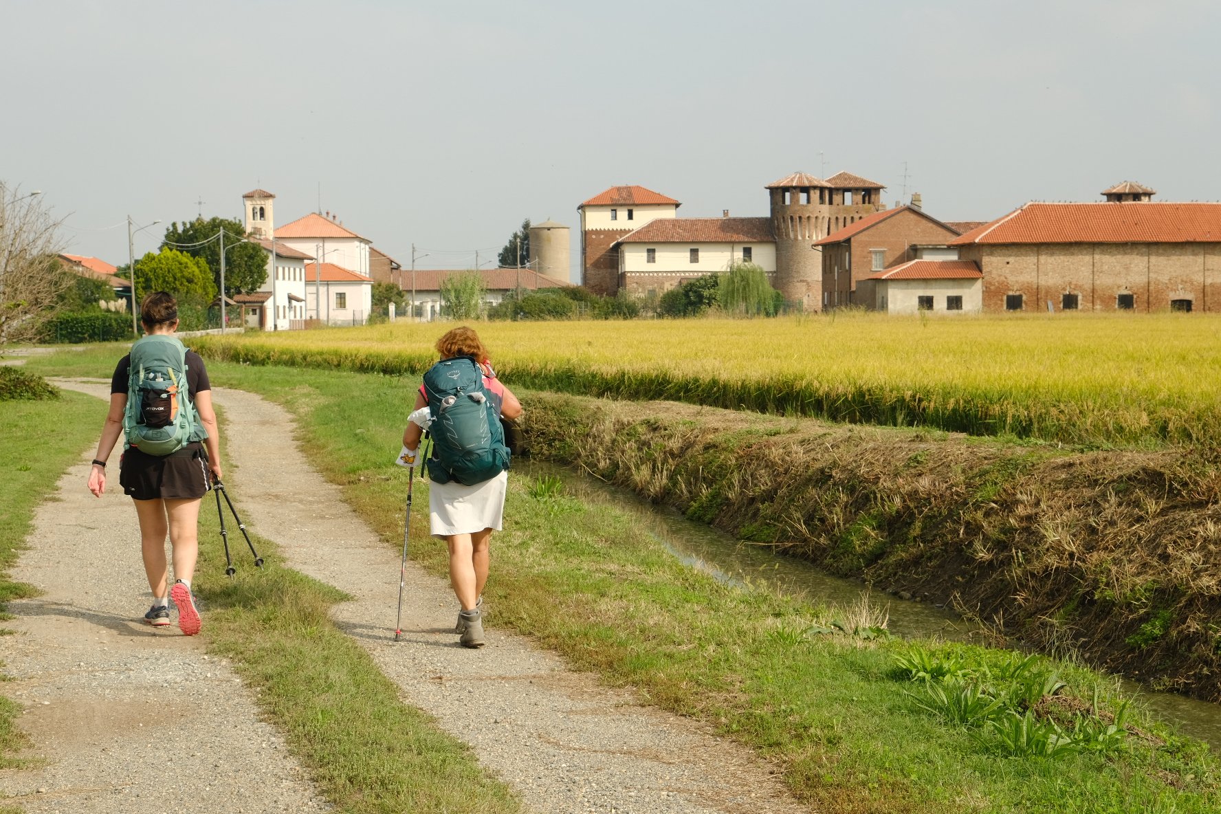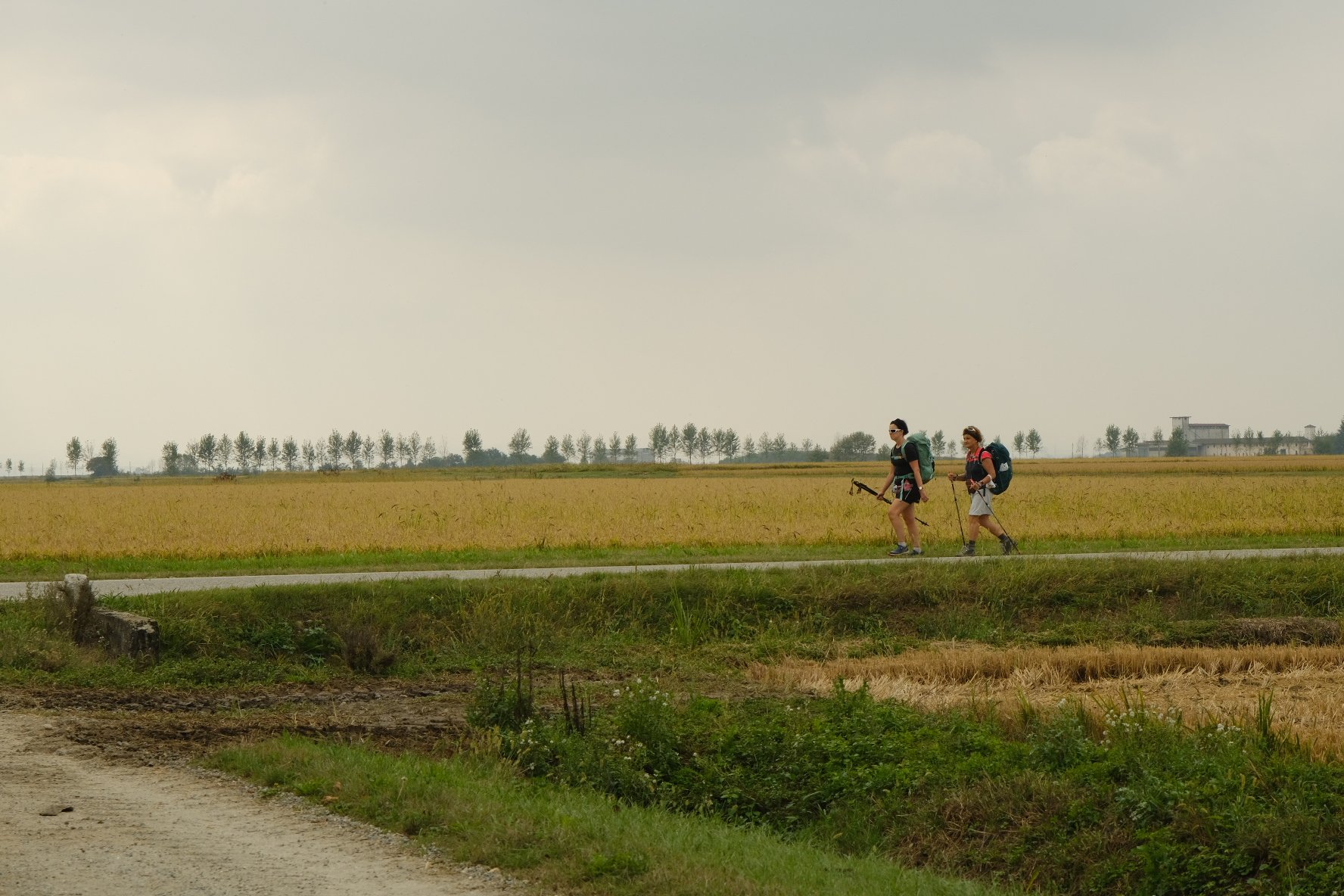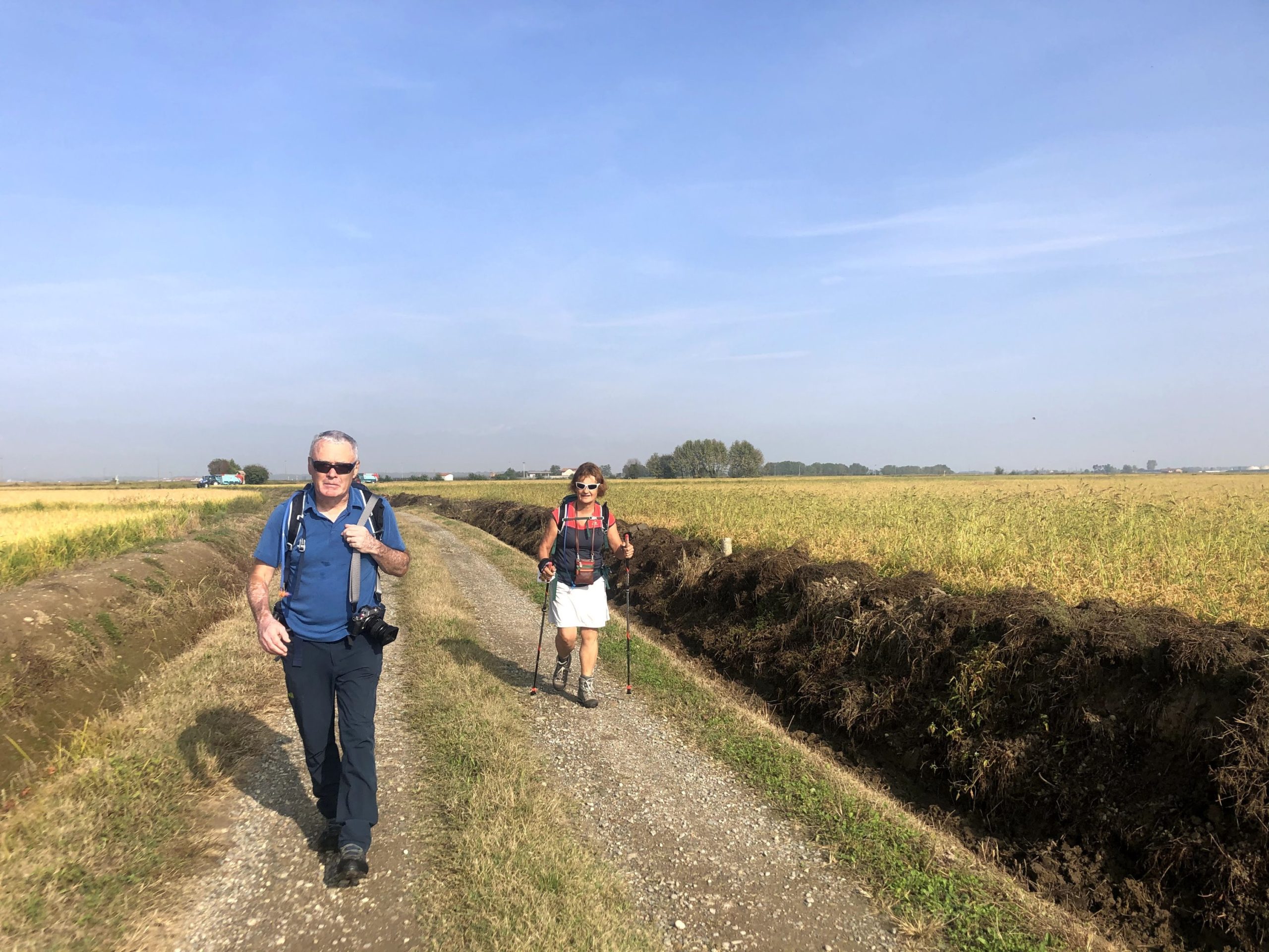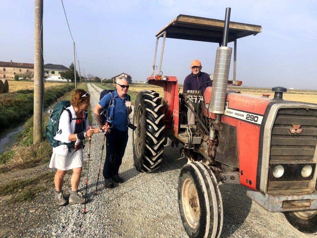 L’étape du jour est une longue marche au milieu des champs de riz à perte de vue. 27km quand même. Beau soleil pas trop chaud. Par contre, à part un petit village à 5km après le départ du matin, plus de point d’eau jusqu’à Vercelli. Donc au petit village, un p’tit café, le plein des gourdes, et hop, partis pour 22km.