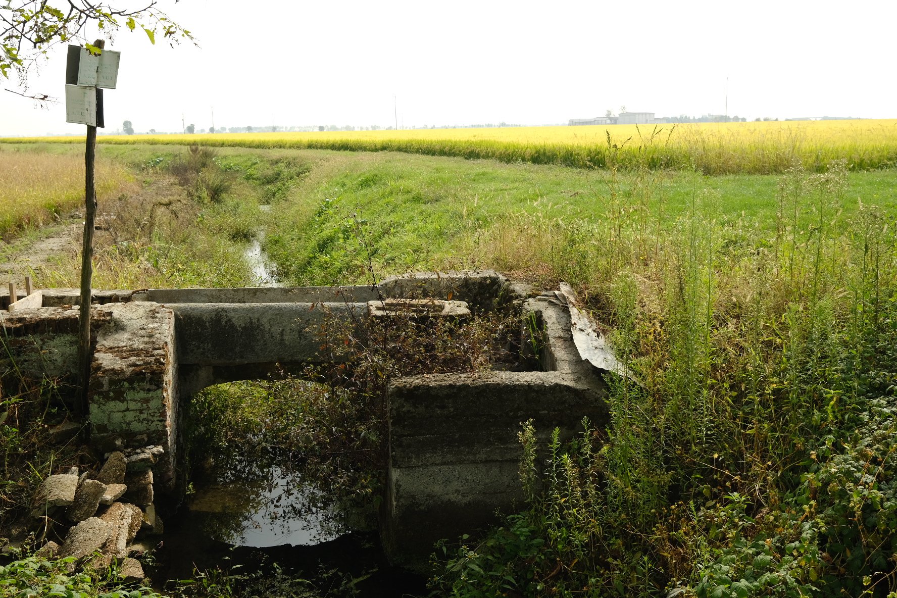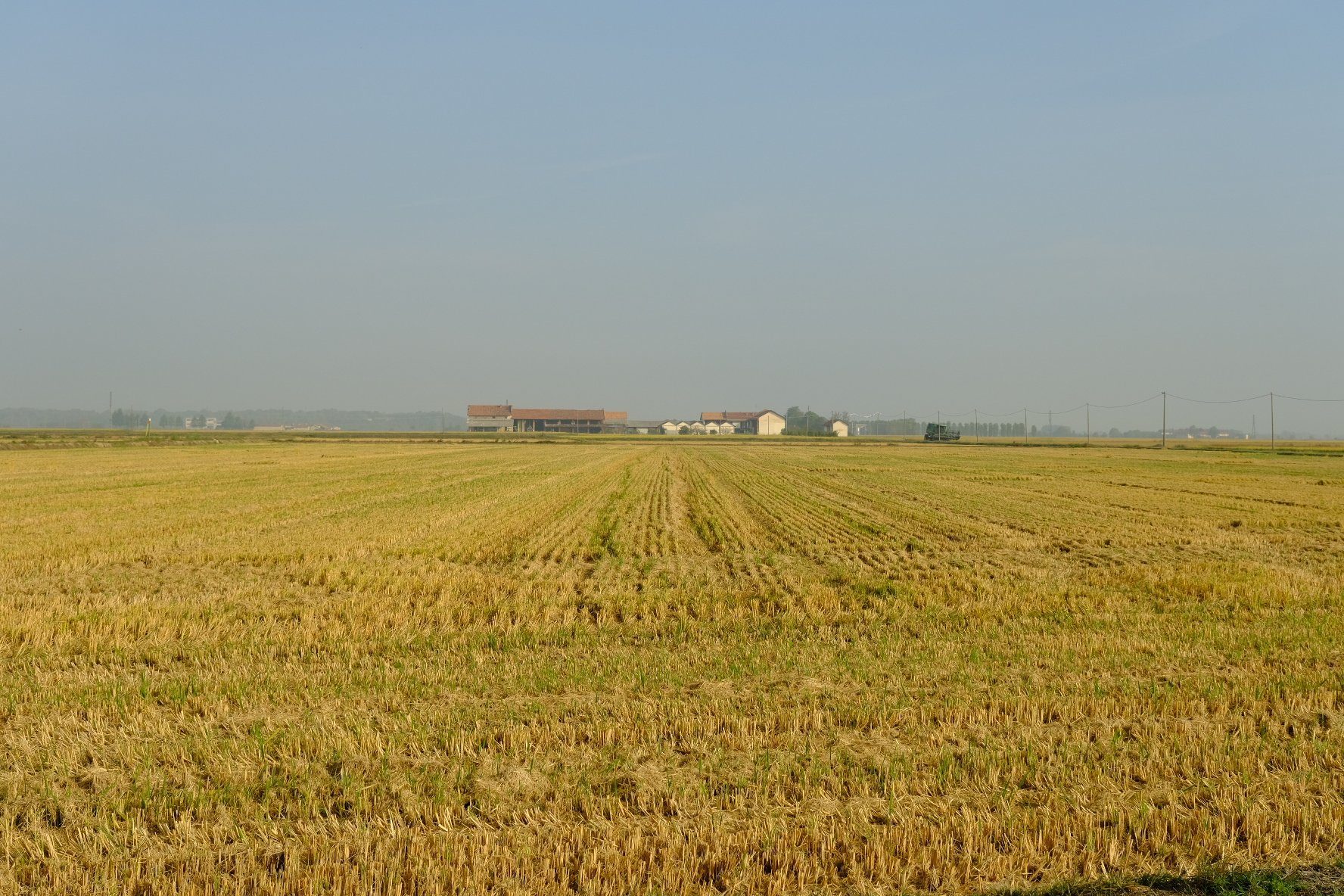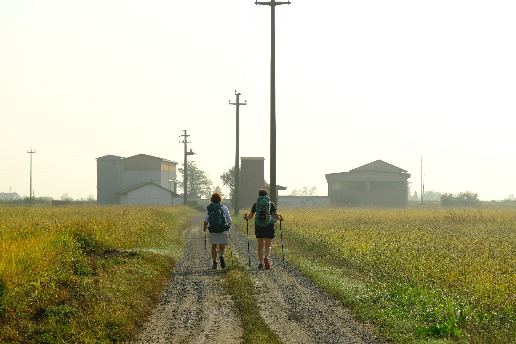 L’étape du jour est une longue marche au milieu des champs de riz à perte de vue. 27km quand même. Beau soleil pas trop chaud. Par contre, à part un petit village à 5km après le départ du matin, plus de point d’eau jusqu’à Vercelli. Donc au petit village, un p’tit café, le plein des gourdes, et hop, partis pour 22km.