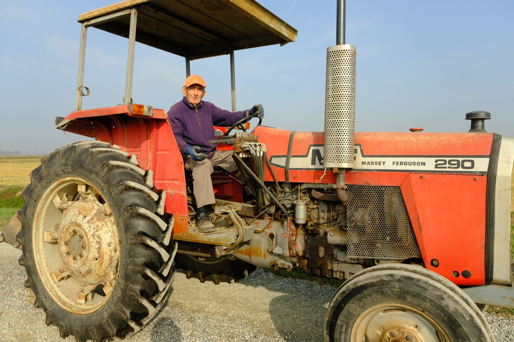 Nous avons conversé avec Carlo, solide bonhomme de 90 ans. Quand son tracteur est arrivé à notre hauteur, il a stoppé l’engin, coupé le moteur afin de discuter.