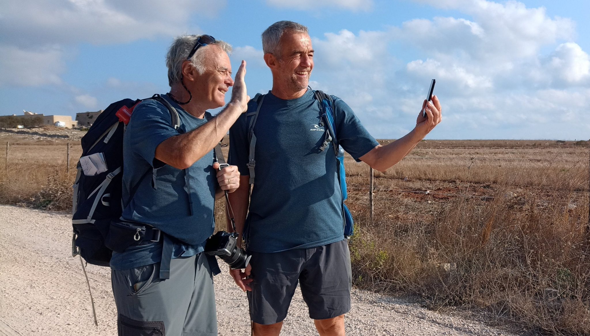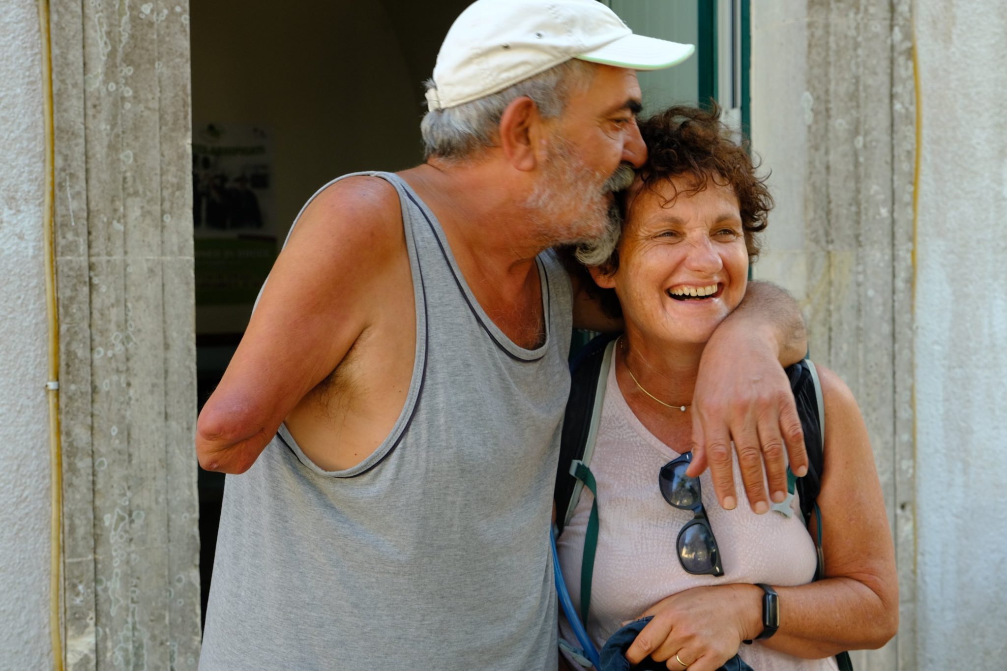 Arrivée à notre avant-dernier repos de la journée, un autre petit village complètement endormi à 15 h ! Ouf, la salle de réunion des citoyens du village est ouverte et son responsable-boissons Roméo accepte de nous servir à boire une boisson rafraîchissante sur la place communale. Et là, commence un bon moment de convivialité italienne : Isabelle lui répond qu’elle s’appelle Juliette et tombe dans les bras (?!?!) de Roméo tout émotionné ! Grands fous rires !