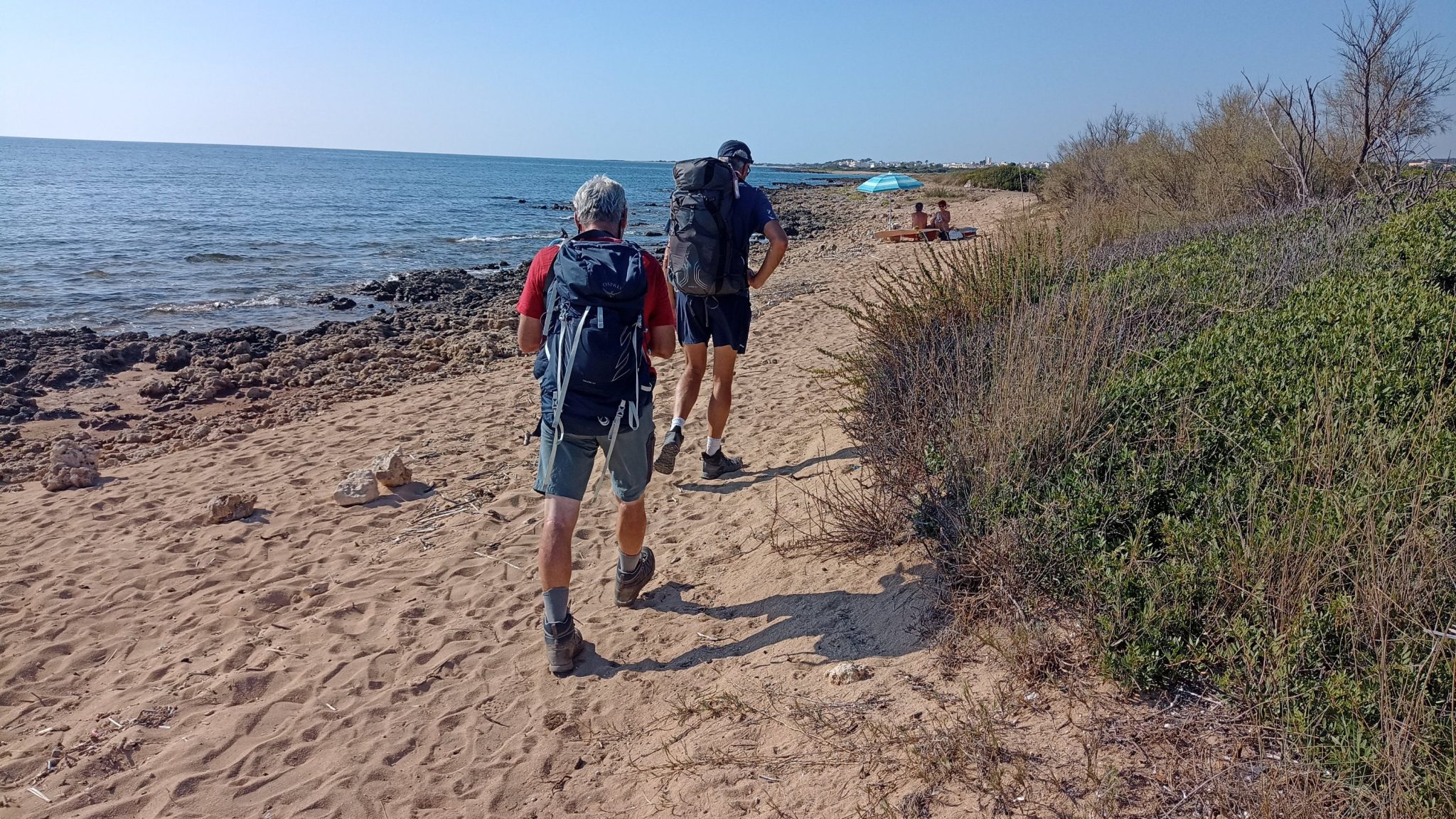 Nous prenons notre pic-nic le long du port de Torre Vado. Puis à partir de là, commence une longue ligne droite d’abord sur la route, puis sur un chemin longeant un petit canal, puis dans le sable le long de la plage. Le soleil cogne sans la moindre ombre. Nous nous liquéfions. Nous avons l’impression qu’il fait aussi chaud que la 1ere semaine. Nous voyons des mirages:  des mousses pour certains, des glaces pour d’autres. Les hommes attentionnés portent le sac à dos d’Isabelle.