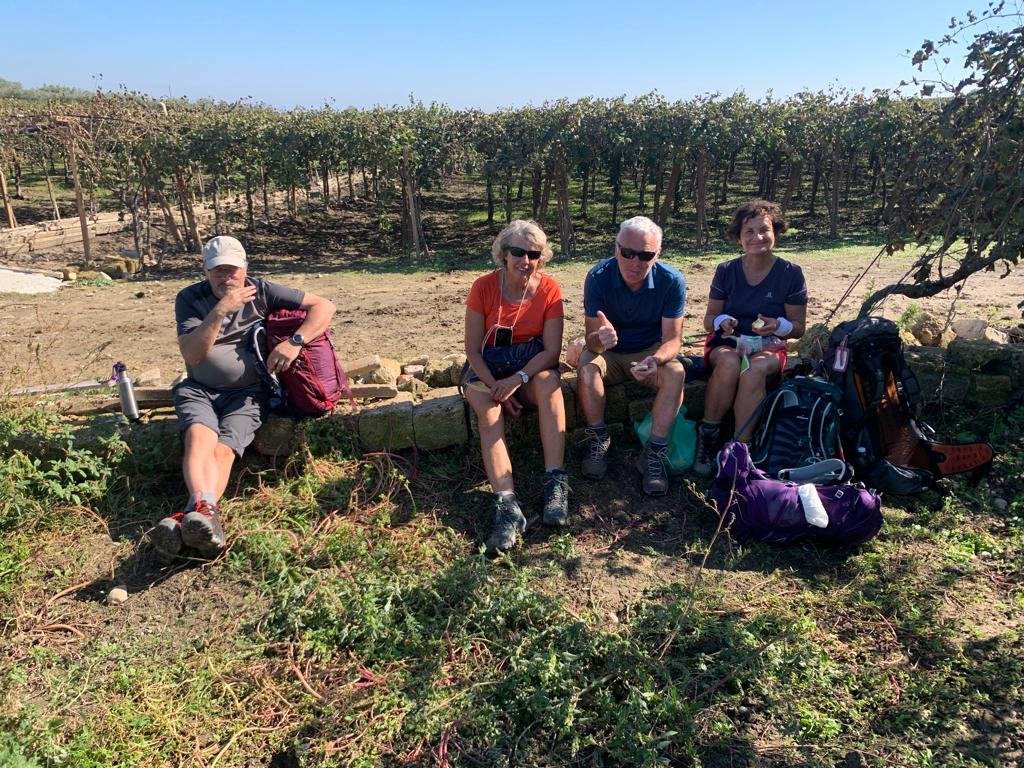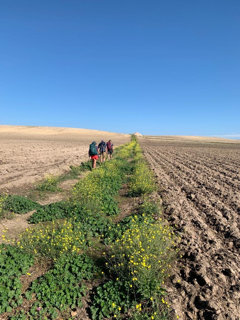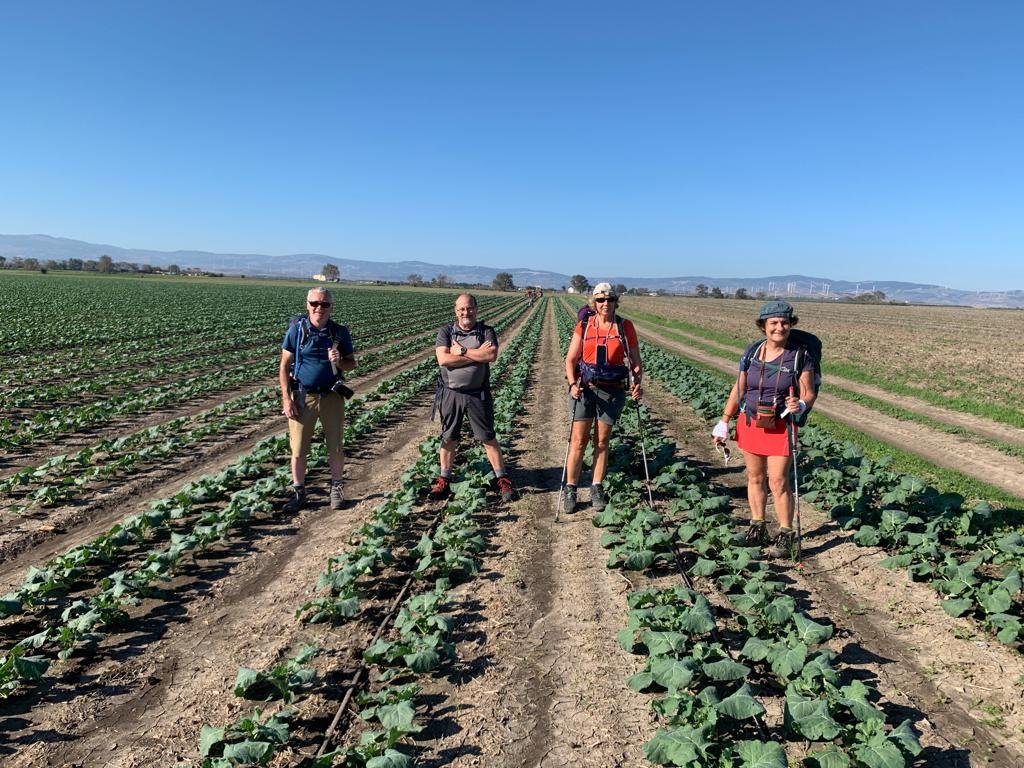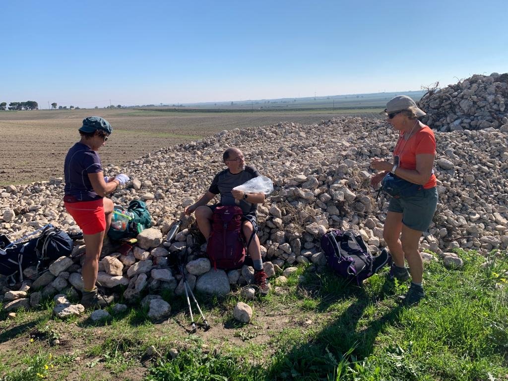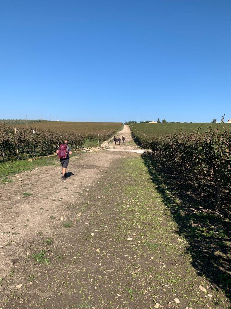 Nous sommes seuls au monde: pas de pèlerins, pas de villages, pas de fontaine à eau, des grandes cultures sans fin. Au bout de l’horizon, la petite ville de San Severo. Nous croisons plusieurs chantiers de cueillette d’olives en plein travail. Sur l’un d’eux, le patron nous explique qu’il doit récolter les olives sur 5.000 arbres. À l’heure du pic-nic, nous croisons deux ânes bien fringants qui sortaient de leur promenade dans les vignes…On vous dit que chaque jour, nous avons des rencontres surprenantes ! Celles-ci furent les seules de notre journée. Notre chemin croise des fleurs de roquette au goût véritable. Plus loin, c’est la culture de brocolettis, de choux et de fenouils.
