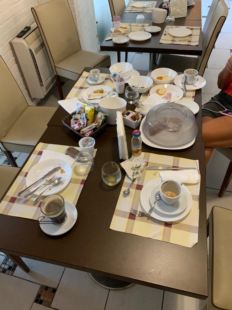Voilà la table du petit-déjeuner de ce matin ! Les ogres sont passés par là… Depuis longtemps, nous n’avions plus eu de table aussi bien fournie. Cela nous donne de l’énergie pour notre longue étape à travers la campagne.