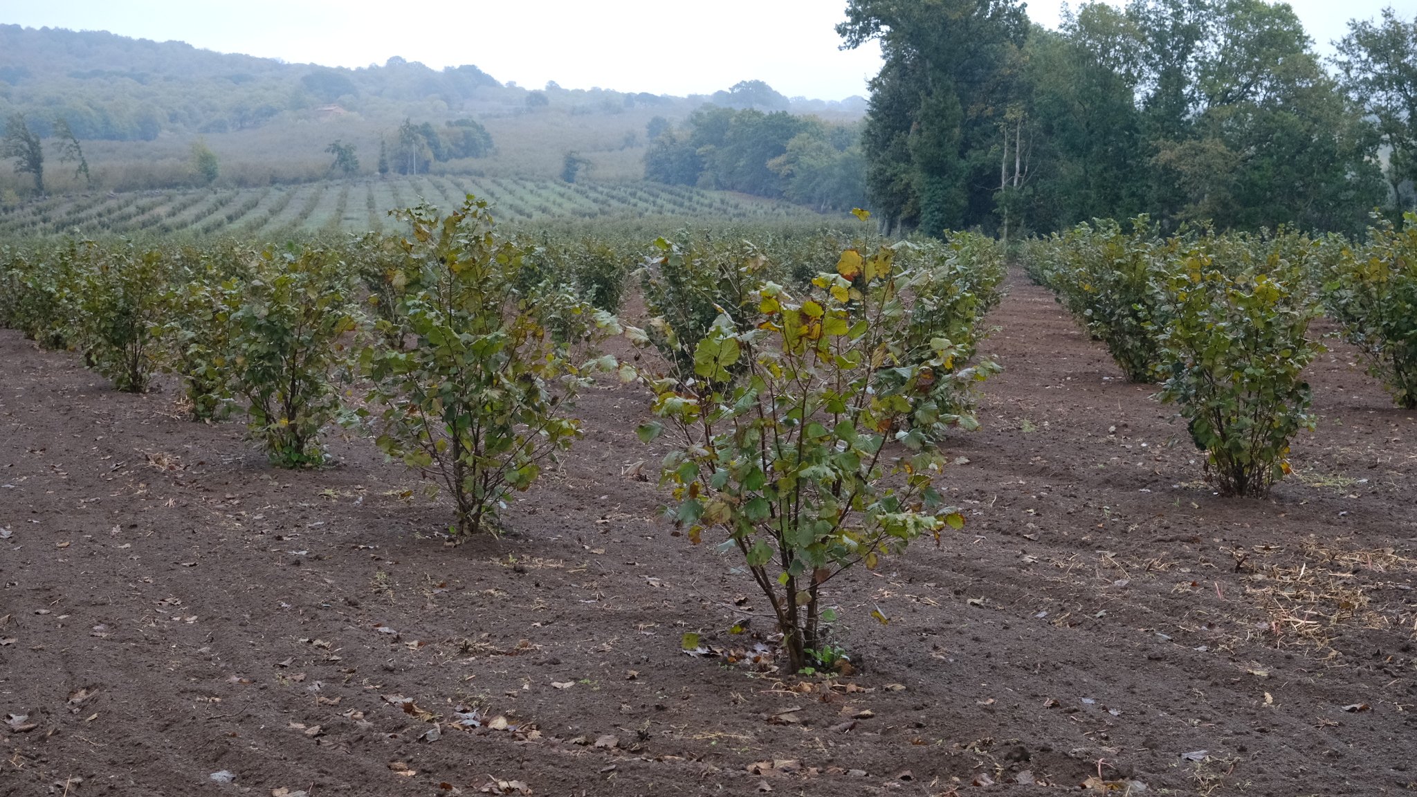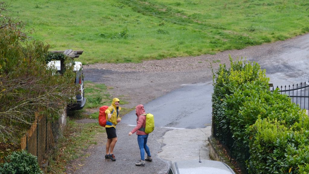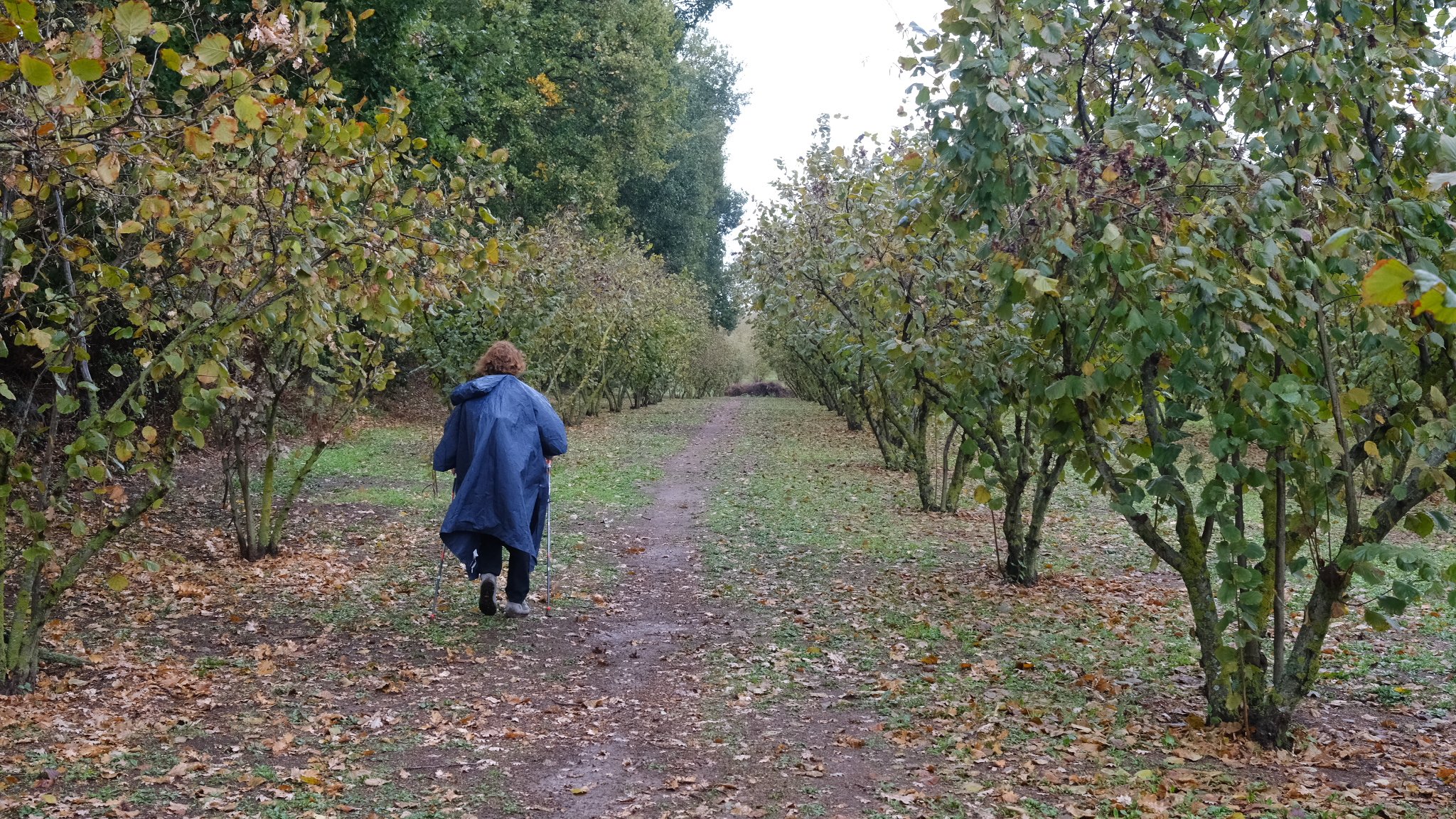La pluie alterne avec le soleil. Aujourd’hui, c’est donc un jour pluie. En fait très très pluie… Nous marchons avec la cape toute la journée. Le parcours du jour est très beau malgré le mauvais temps qui nous a souvent forcés à regarder le sol plutôt que la pluie. De toute part sur des kilomètres, le parcours passe au milieu de champs de noisetiers. Nous n’avons rencontré aucun marcheur de toute la journée (vu le temps, ce n’est pas vraiment étonnant), sauf un jeune français qui marche depuis Montélimar et va à Rome, mais qui pense bien continuer vers les Pouilles. Il pensait bien faire du camping cette nuit, mais un peu plus tard nous l’avons vu attendre le bus.